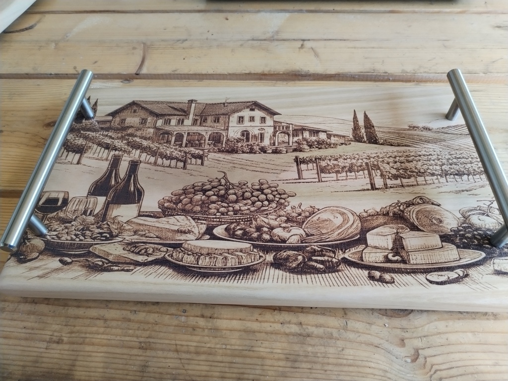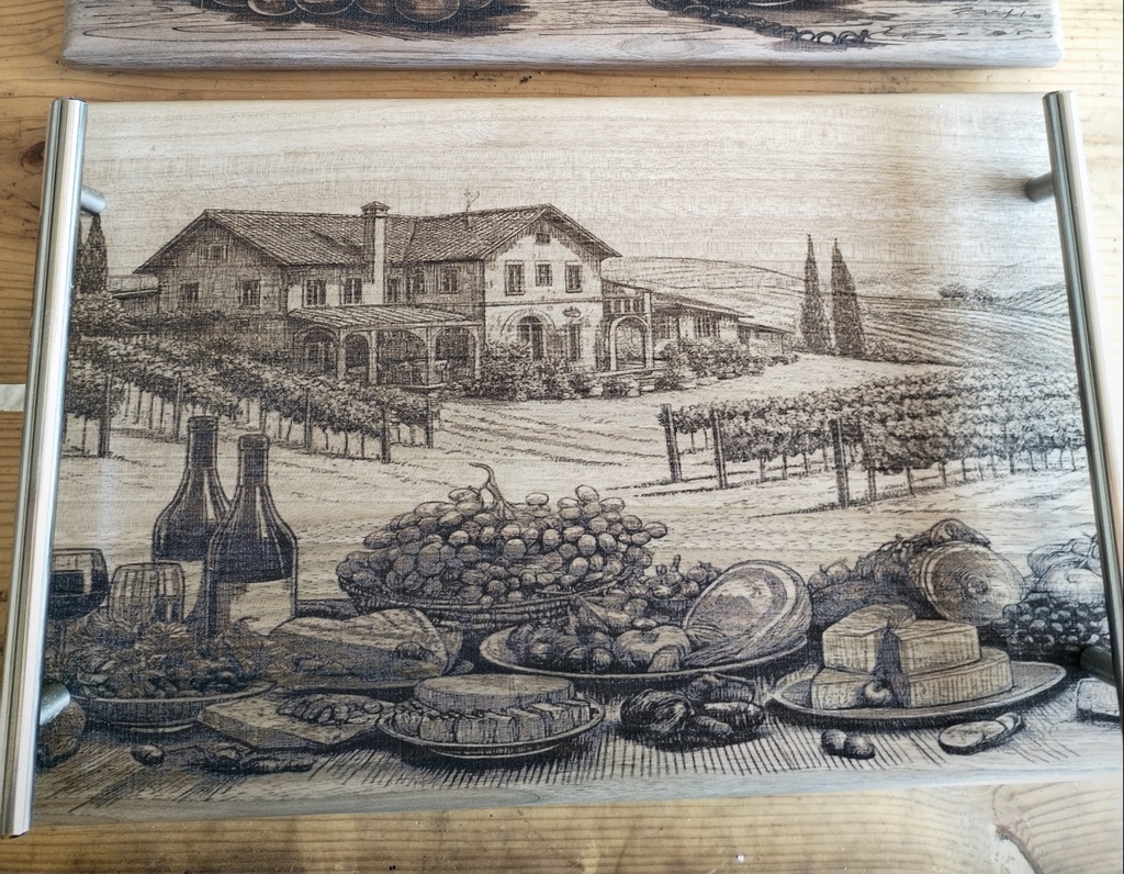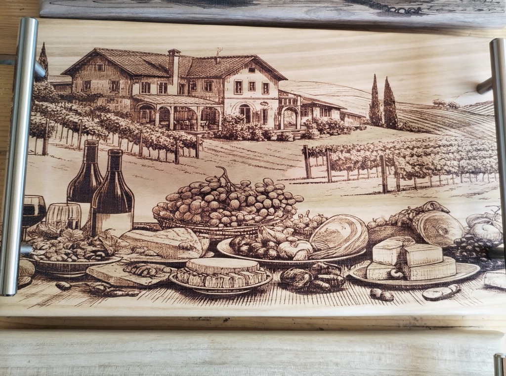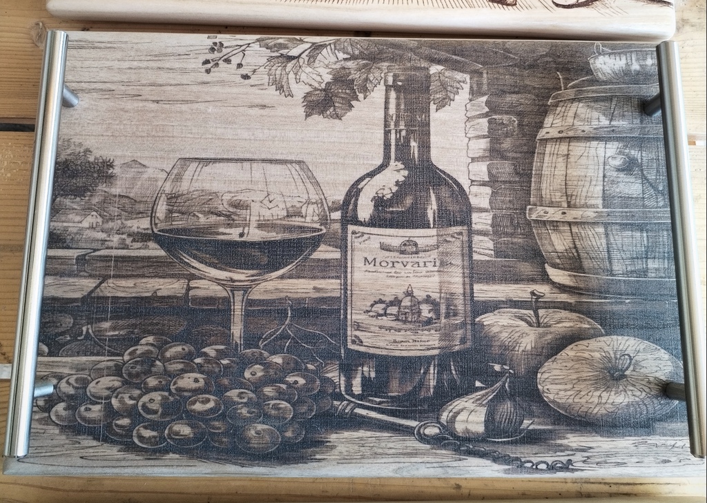 Na celoj površini je laserski izgravirana slika sa motivima vinarija u rustičnom stilu.
